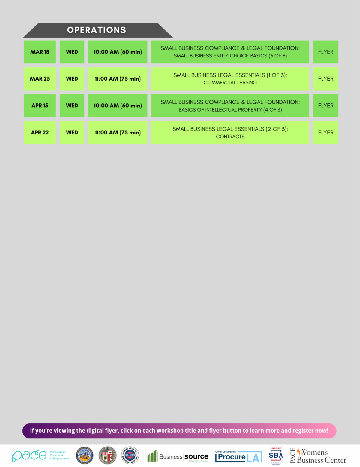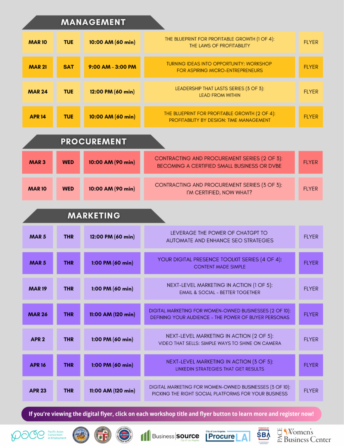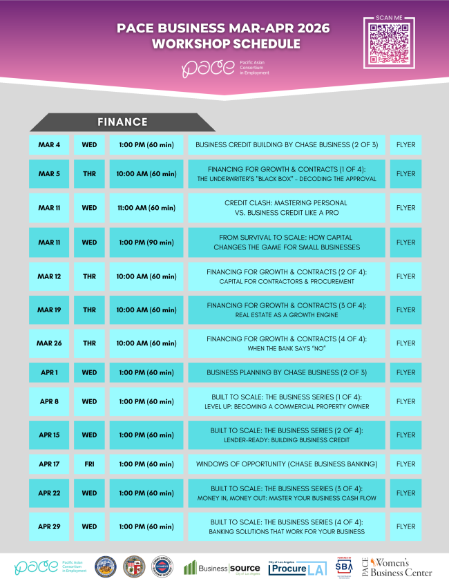 PACE Business offers free webinars on finance, marketing, management, procurement, operations, and more. Register now by clicking on each webinar title or its corresponding flyer button on the Workshop Schedule Flyer.