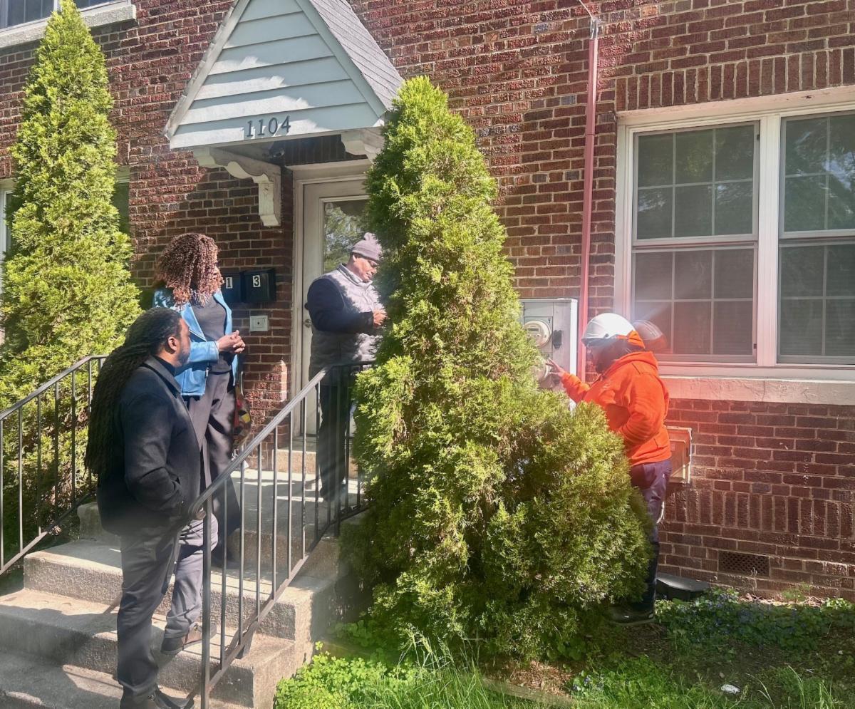 OPC consumer outreach and engineering staff joined Pepco field technicians and a Public Service Commission compliance officer to investigate the complaint. Pepco and the Commission had conducted a meter test on an earlier site visit. However, OPC’s evaluation of the results and communications with the consumer warranted a follow-up visit to get to the root cause of the consumer’s complaint. (OPC’s Engineer Jason Cumberbatch and Consumer Outreach Specialist Jean Gross-Bethel are lower left below.) |