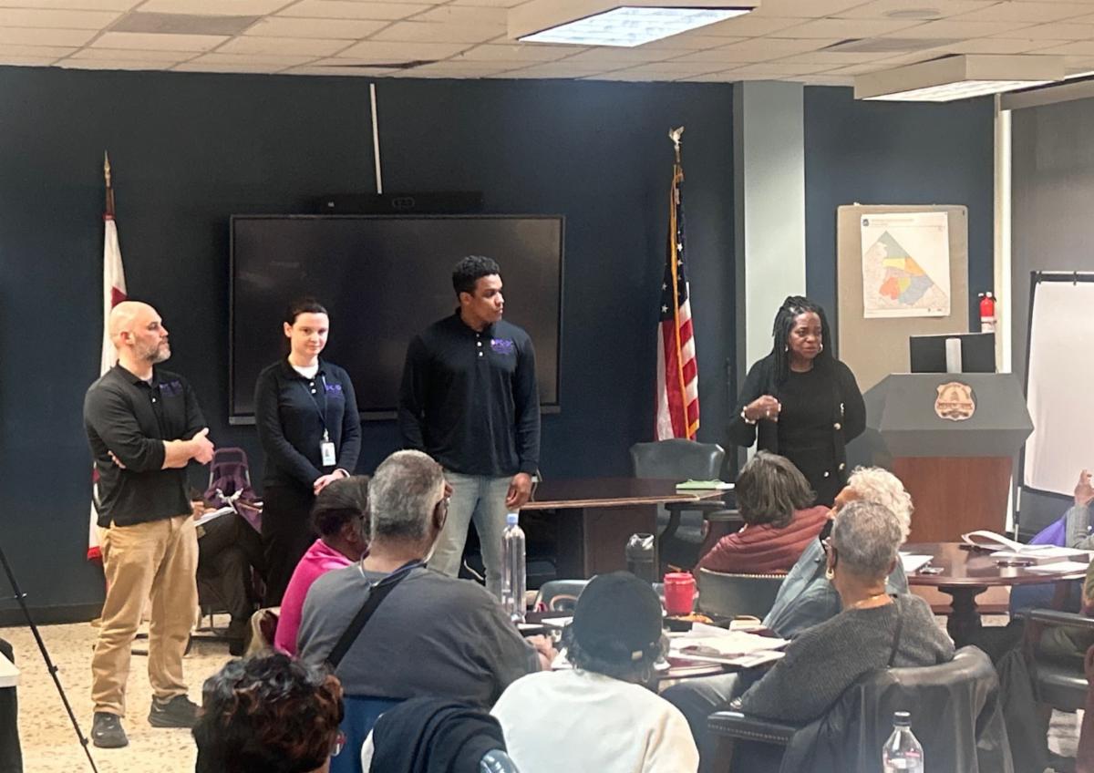 OPC’s Adam Carlesco, Claire Shibelski, Antaeus Hayes, and Valca Valentine speak to the Ward 4 Mini-Commission on Aging about the work of the OPC Water Services Division that benefits senior consumers. OPC’s Jean Gross-Bethel is below upper right.